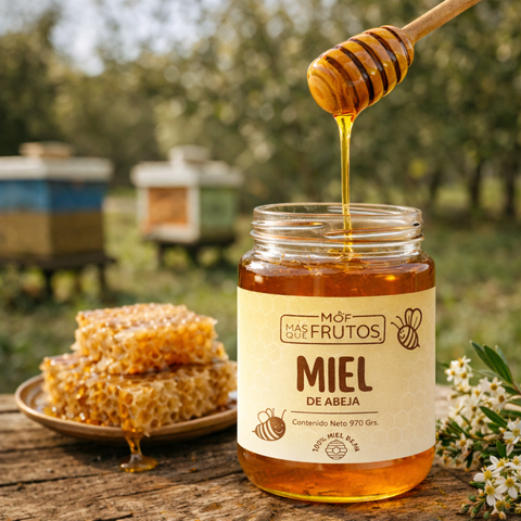 Miel 100% de Abejas, producto propio de Más que Frutos. Nuestra miel nace en la VI Región, donde los ríos Cachapoal y Tinguiririca dan vida a una de las zonas agrícolas más ricas del país.